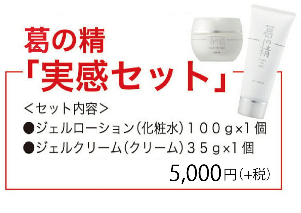 商品名 葛の精実感セット 内容量 【ジェルローション】100g【ジェルクリーム】35g ご使用方法 【ジェルローション】洗顔のあと、チューブから1〜2cmを手のひらに取り、お顔全体になじませてください。